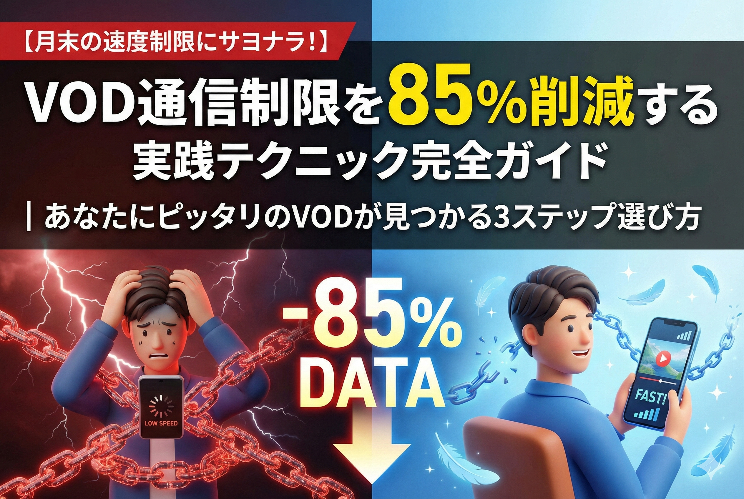 しかし、便利なVODサービスには「通信量」という大きな問題が立ちはだかっています。最高画質にすると1時間に約5.8GBもの通信量がかかります。つまり、最高画質で映画を1本見るだけで、多くの方の月間データ容量を一気に消費してしまうのです。